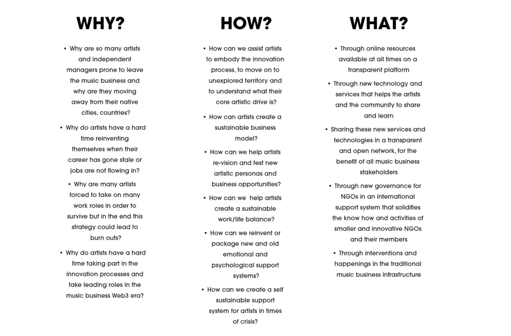 We do this through ongoing research and prototyping in a co-design process with our members and stakeholders from all fields in the local and global music family. You are welcome to contact us if you have any ideas, thoughts or other inquiries about the future of the music landscape that you want to discuss and explore.